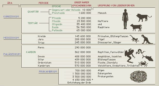 Die geologische Zeittafel zeigt die Gliederung der Erdgeschichte, den Beginn der Zeitabschnitte in Jahren und das erste Auftreten bestimmter Tier- und Pflanzengruppen.